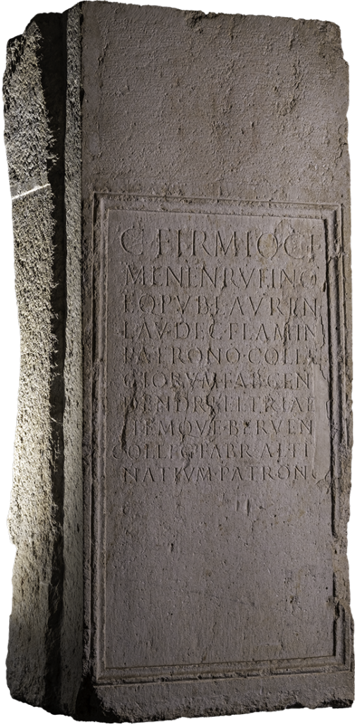 Come talvolta accade anche oggi, al tempo di Feltria si usava scrivere alla base delle statue il nome del personaggio rappresentato, chi dedicava e le cariche e i motivi per cui il dedicatario ero degno del monumento. In questo caso la scultura era dedicata a Caio Firmio Rufino, figlio di Caio, appartenente alla tribù Menenia. L’indicazione della tribù, non scontata, ci permette di accertare che Rufino era feltrino d’origine – per motivi censuari tutti i cittadini romani residenti a Feltria erano ascritti a questa tribù. Esplicitati invece nelle ultime due righe, con la specificazione che Caio Firmio Rufino era il loro patrono, i dedicanti della statua erano gli esponenti del collegio dei fabri di Altino; una corporazione di lavoratori dei materiali duri, in particolare pietre, metalli e legno, presente in tutte le città dell’impero. È davvero significativo che i fabri di una città come Altino, assai rilevante in epoca romana, avessero come patrono un feltrino. Tale aspetto si spiega bene se si analizzano le cariche rivestite da Rufino in vita. Sono descritte nelle righe centrali del testo e si possono dividere in tre tipologie: politiche, religiose e commerciali.