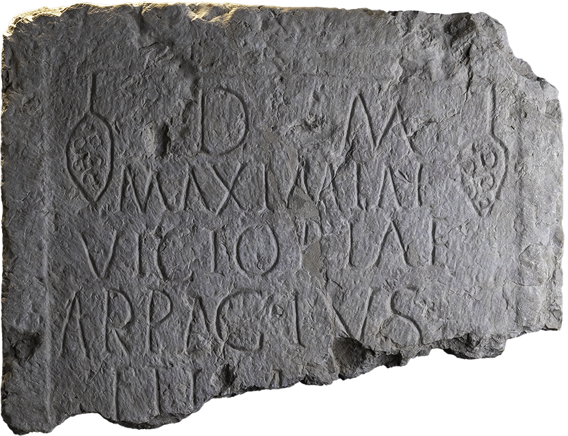 Rinvenuta a Feltre nel 1922 durante i lavori per la canonica del Duomo assieme all’ara di Anna Perenna, questa stele, dedicata a Maximia Victoria, è purtroppo mutila di tutta la sua parte inferiore. L’epigrafe, in calcare di provenienza locale decorato con l’incisione di tralci di vite, si caratterizza chiaramente come funeraria per la consacrazione – ovvero la presenza di una dedica – agli Dei Mani, che era la divinità degli inferi. Il dedicante risulta essere tale Arpagius, un personaggio di chiara origine grecanica. Ciò potrebbe far pensare al fatto che si trattasse di uno schiavo, forse legato alla stessa Maximia Victoria, per la quale il monumento funebre fu eretto. Arpagius non doveva però essere l’unico dedicante, poiché nell’ultima riga del testo, appena sopra la frattura dell’iscrizione, si riescono a distinguere la parola “Et” (e) e l’iniziale (I) di un altro nominativo.